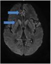 (A) Brain MRI images with Axial FLAIR sequence at the centrum semiovale show a small cortical hypersignal in the superior frontal gyrus bilaterally (blue arrow). (B) Brain MRI images at the basal ganglia level also demonstrate a symmetric and bilateral hypersignal in the caudate and putamen, as well as in the superior frontal gyri (blue arrow).
