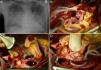 (A) Preoperative X-ray of the chest shows severe congestion and concomitant bilateral pneumonic infiltrations. Intraoperative findings are demonstrated in (B-D). (B) Aortic and mitral valve are excised. Remaining are the phlegmone-like alteration to the myocardium(*) and the abscess formation(**) at the former aorto-mitral continuity. The left coronary artery is already isolated (**) (B) Mitral valve prosthesis is already implanted (*). The aortic conduit has to be fixed “valve-to-valve” (**) due to destroyed aorto-mitral continuity. (C, D) Aortic conduit and mitral valve prosthesis are in situ and the left atrium is reconstructed by patch (*).