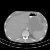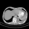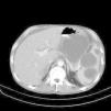 Regarding imaging assessment, abdominal sonography demonstrated ascitis (free fluid in abdomen and pelvic), hypoechoic lesions, calcified lesions and lesions with calcified rim in liver, two similar lesions in pancreas and similar lesions in spleen beside splenomegaly and a 5mm stone and two calcified cyst containing debris in spleen. In chest X-ray (CXR) decreased disk height at T11–T12 level with collapsed T11 vertebral body and paravertebral soft tissue were observed. Abdominal CT showed small sized hypodense lesions in left lobe of liver (Fig. 1), multiple hypodense splenic (Fig. 2) and pancreatic lesions (Fig. 3), left sided pleural effusion, thickening of jejuneal mucosa and edema of bowel wall and ascites (Fig. 4). Vertebral body lesion and paravertebral abscess (Fig. 5), bony calvarial involvement and adjacent extra-axial brain lesion (Fig. 6) are other findings.