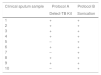 Protocol B - sonication (in-house method)A microtube containing 500 µL of sputum sample pretreated as mentioned above, was placed at 95 °C for 20 min. After this step, it was placed in the sonication bath for 15 min, and then it was centrifuged for 5 min at 3000 g. Subsequently, 100 μL of the supernatant (containing the DNA) was transferred to a new microtube and frozen at −20 °C until use.