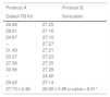 The amplifications Cts by real-time PCR and the means of each DNA extraction protocol are shown in (Table 2). Comparing Cts of protocol 1 vs. 2, there was statistical difference (27.73 ± 2.48 vs. 26.92 ± 0.89; p < 0.01).