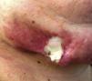 | High fever, new nodules | ESR 10mm/h, WBC 7070mm–3, Hb 13.8g/L, CRP 9.7mg/dL | Ceftizoxime 6g/d+clindamycin 1800mg/d | 1st⇒14th days | Partial resolution, new lesion (chin) |