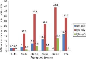 ResultsThere were 110 (45.3%) males and 133 (54.7%) females between five and 80 years of age. Participants were mostly in the age-range of 30–44 years (34.2%) while 2.5% were in age group 75–80 years (Table 1). Out of 243 febrile participants screened, 14 (5.8%) had anti-CHIKV IgM, 61 (25.1%) had anti-IgG and 8 (3.3%) had both IgG and IgM. Overall prevalence of 34.2% (83/243) was observed (Table 1). IgM and IgG seropositivity was significantly associated with male sex (p=0.044, X2=4.075). Males had almost two-fold greater chance of contracting CHIKV compared to females (OR=1.7, CI=1.014–2.955). CHIKV seropositivity increased with age,a s shown in Fig. 1 (p<0.001). Active CHIKV infection was found in all age groups, but more common in people older than 75 years. Active infection was lowest in age group 5–14 years. Dual seropositivity was more observed in married people compared to divorced, widowed and single individuals (p=0.002; Table 2). With exception of those with primary level of education, there was increasing trend in seropositivity as educational level increased. Farmers had higher prevalence of current infection (48.1%), followed by people who engaged in business activities. Significant association was observed between participant’s occupation and active infection (p<0.001). Insecticide users had higher seropositivity (41.6%) compared to non-users (29.2%). Fever (10.8%), abdominal pain (10.8%), and diarrhea (9.5%) were associated with high IgM levels and dual (IgG and IgM) seropositivity. However, this was not statistically significant (Table 3). Significant association was observed between joint pain and IgG seropositivity (p=0.042). Participants who were confirmed with malaria were twice more likely to have been previously exposed to Chikungunya (p=0.033, OR=2.0, CI: 1.051–3.997).