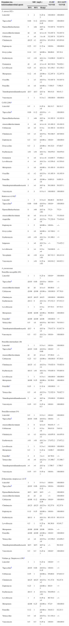 | Doxycycline | 1 | >8 | ≤0.06 to >8 | 80.4/18.6 | −/− |