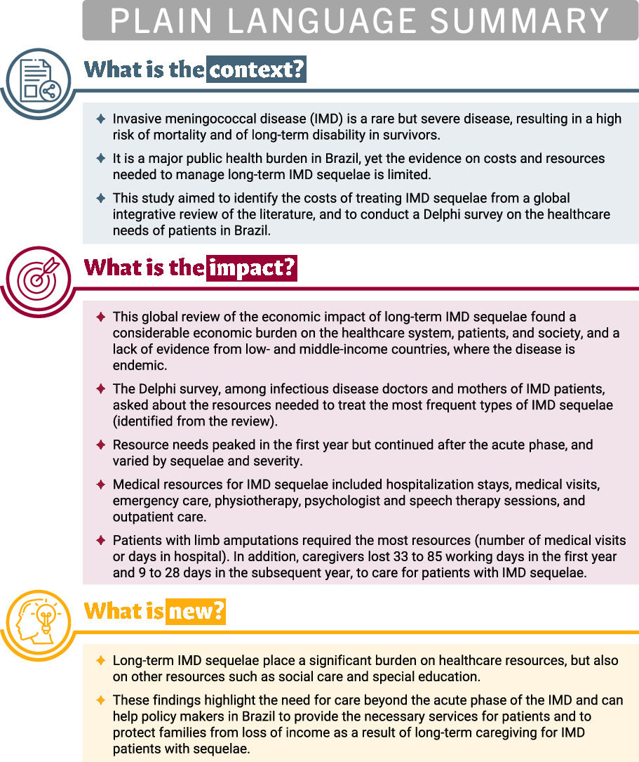 A recent systematic review on the global costs of IMD and sequelae reported around 40 % of IMD patients developed sequelae, and healthcare costs were almost twice as high in patients with sequelae versus without. The review included only studies with primary data collection, thus did not identify non-medical and indirect costs of IMD (e.g., productivity losses) and did not report specific costs of sequelae. In addition, most studies only followed patients until discharge, so long-term rehabilitation and care costs were not identified. There were no studies from Brazil.14