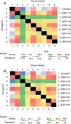 Comparison of homology between Guizhou HRSV subgroup B isolates 3′ end of G gene nucleotide and amino acid sequences with that of the prototype strain CH18537 in colored heat map. A, comparison of nucleotide sequences homology of subgroup B; B, homology comparison of amino acid sequences of subgroup B. Red indicates the maximum identity, blue indicates the minimum identity, white indicates the middle value, green indicates the maximum divergence, red indicates the minimum divergence, yellow indicates the middle value.