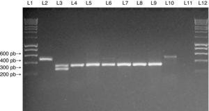 For each PCR assay, DNA from each isolate was amplified in a reaction volume of 25μL containing 12.5μL of the PCR mix (PCR master mix; Promega®), 0.2uM of each primer, and 5μL of DNA template. The reaction was performed in a Perkin-Elmer thermal cycler under the following conditions: an initial denaturation step at 94°C for 5min, followed by 30 cycles of 94°C for 1min, 50°C for 1min, and 72°C for 2min, with a final extension at 72°C for 10min. PCR products were visualized in a 2% agarose gel stained with ethidium bromide under UV transillumination.