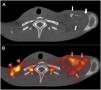(A) Axial CT image (bone window) showing large erosions of the left clavicle with soft tissue swelling (white arrows). (B) Axial fused FDG PET/CT image showing FDG uptake (red arrows) of the lytic lesions in the left clavicle and in the fluid collection around the bone (SUVmax = 14.3). There is also intense uptake in the right supraclavicular lymph nodes (arrowheads).