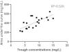 Table 1 summarizes the characteristics of the patients at the beginning of therapeutic monitoring and the vancomycin pharmacokinetic parameters. After the vancomycin initial dosing regimen, only 6 (37 %) patients reached the therapeutic target against Gram-positive pathogens with MIC 1 mg/L; 9 patients (56 %) had subtherapeutic concentration (AUC < 400 mg.h/L); and 1 (6 %) patient had a supratherapeutic initial AUC value (> 600 mg.h/L). After individual dose adjustments, all patients reached the target. The median of the adjusted dose targeting AUC of 500 mg/L was 63 mg/kg/day. The relationship between trough levels and the 24-hour AUC is presented in Fig. 1 (R = 0.529). There were no reports of vancomycin-induced nephrotoxicity or infusion reactions during the period of study. No drug interactions were identified between vancomycin and concomitant drugs.