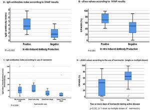 To calculate the sample size we estimated that 75% of COVID-19 patients would have a positive IVIAP test, and only 30% of those using ivermectin would do so. A total of 46 participants would provide 80% power, 95% confidence intervals (CI) for the study. Mann-Whitney rank test was used to compare medians of IgG antibody Index and cPASS versus IVIAP (positive/negative) and use of Ivermectin (1 ≤ dose versus multiple doses). Fisher exact text (bicaudal) was used to compare ivermectin use versus ELISA, IVIAP, cPASS (less than 20%, as negative, 20% or more, positive) results.